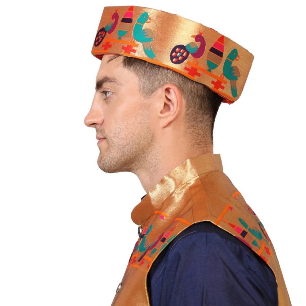 This Paithani parrot peacock topi blends tradition, colour, and craftsmanship to create a standout accessory. Its rich motifs and elegant design make it an essential part of every man’s festive wardrobe.