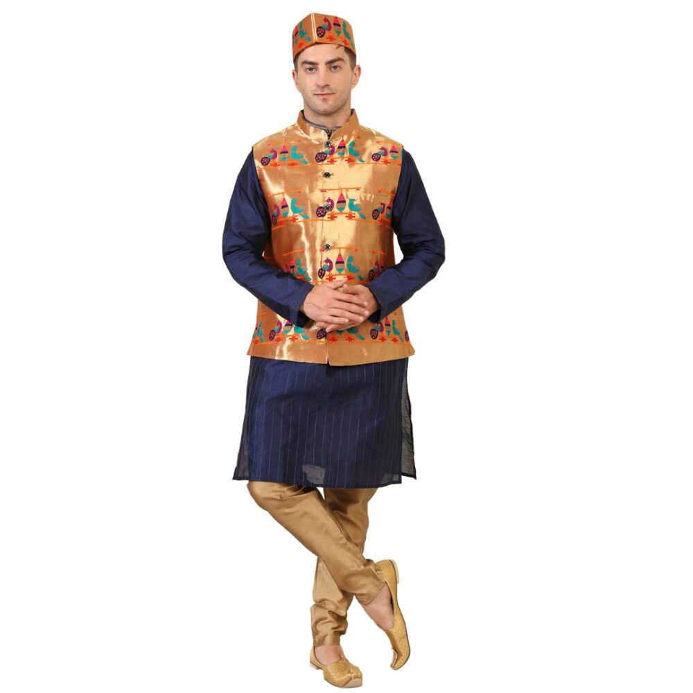 The Paithani topi pairs well with kurtas, dhotis, sherwanis, and Indo-western outfits. Whether you are attending a wedding, participating in rituals, or dressing for cultural events, this topi adds an authentic and vibrant touch to your look. Its festive design makes it a great choice for haldi, sangeet, traditional day functions, and family celebrations.