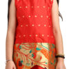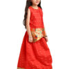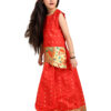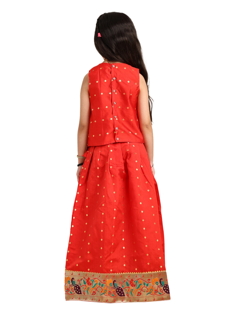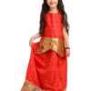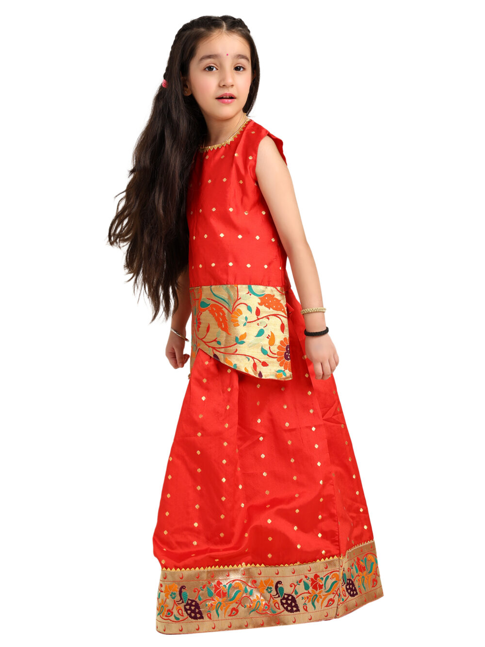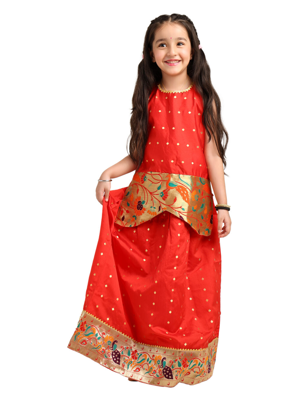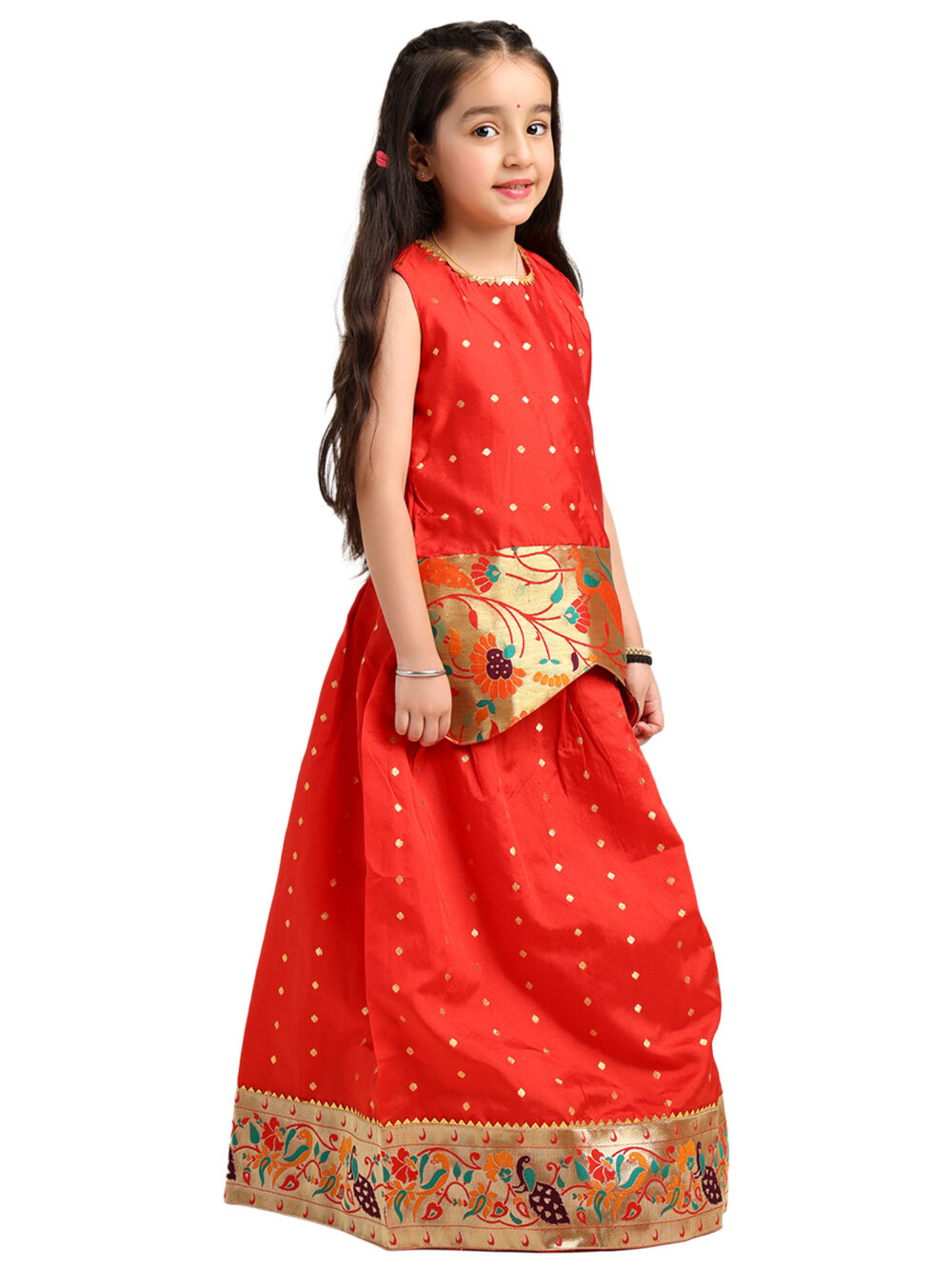 Add a regal touch to your little one’s festive wardrobe with this Paithani Baby Girl Lehenga Set in a striking bright red shade. This set features a sleeveless silk peplum-style top with golden butti motifs and a wrap-over brocade panel at the waist, designed in classic Paithani style with floral vines and traditional detailing.