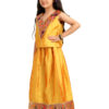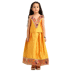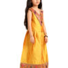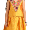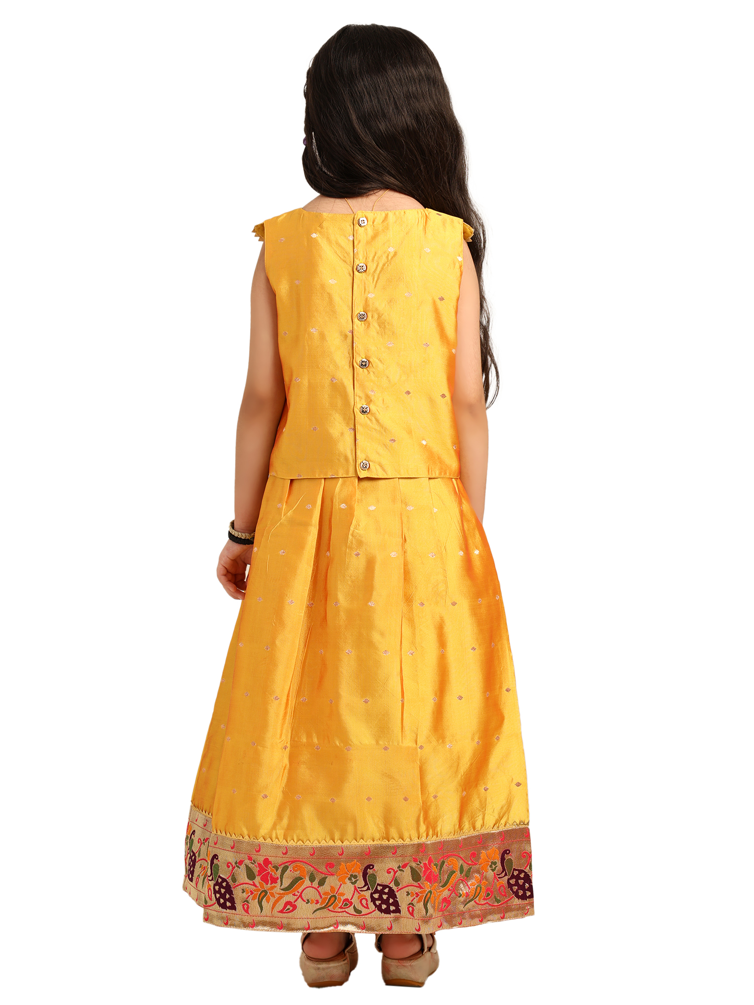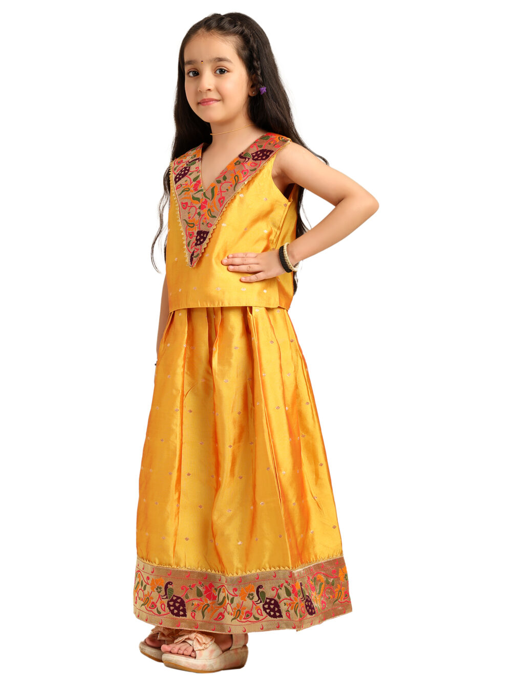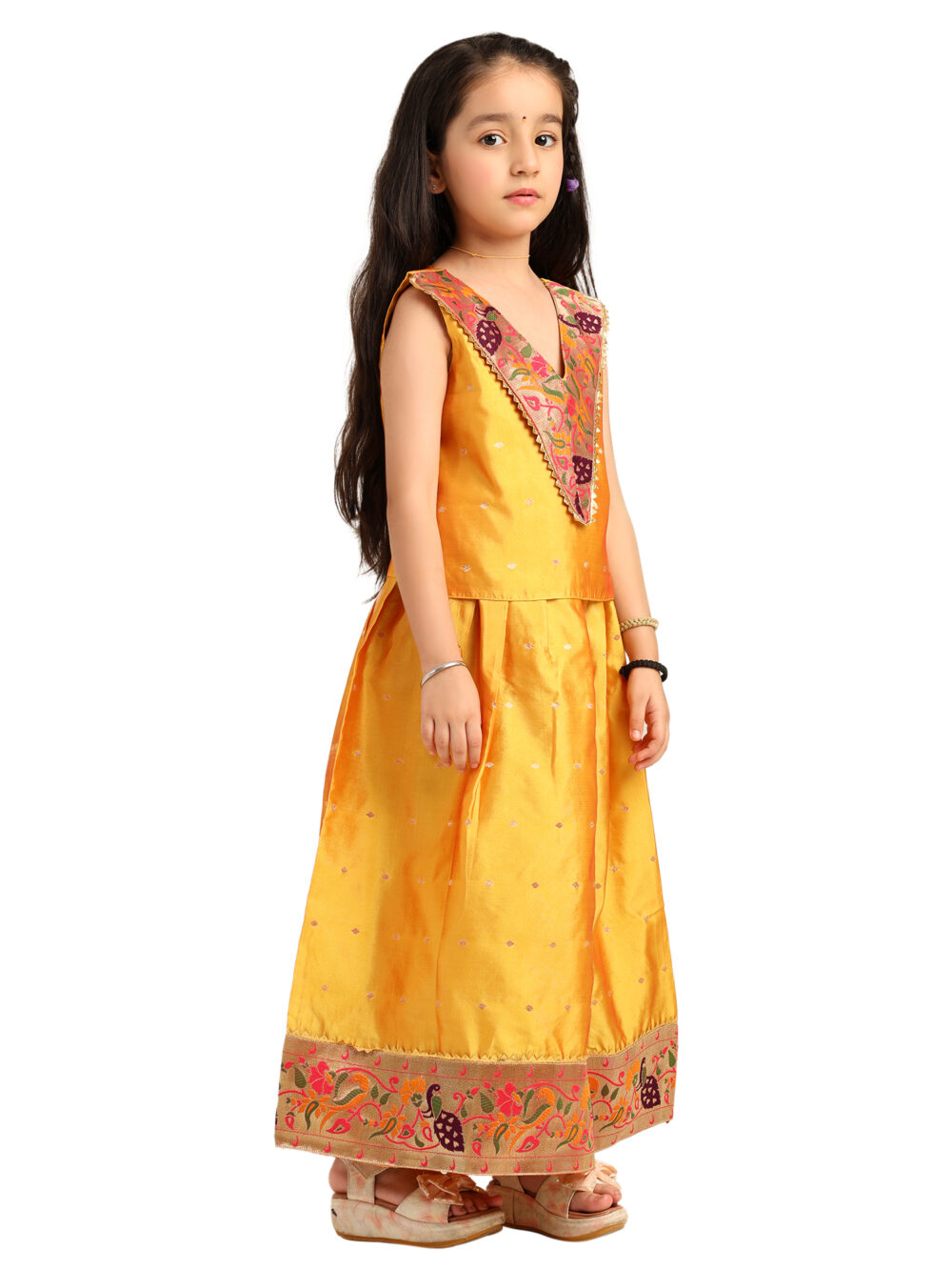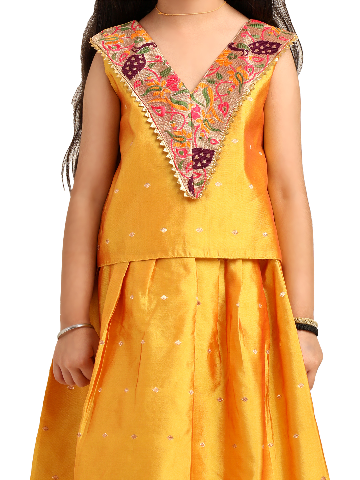 Brighten up festive moments with this elegant Mustard Yellow Paithani Baby Girl Lehenga Set, beautifully crafted to add joy and tradition to your little one’s look. The sleeveless blouse features a standout V-neck Paithani brocade collar, intricately embroidered with multicolor peacocks and floral vines, finished with dainty golden scalloped lace for a refined finish.