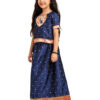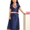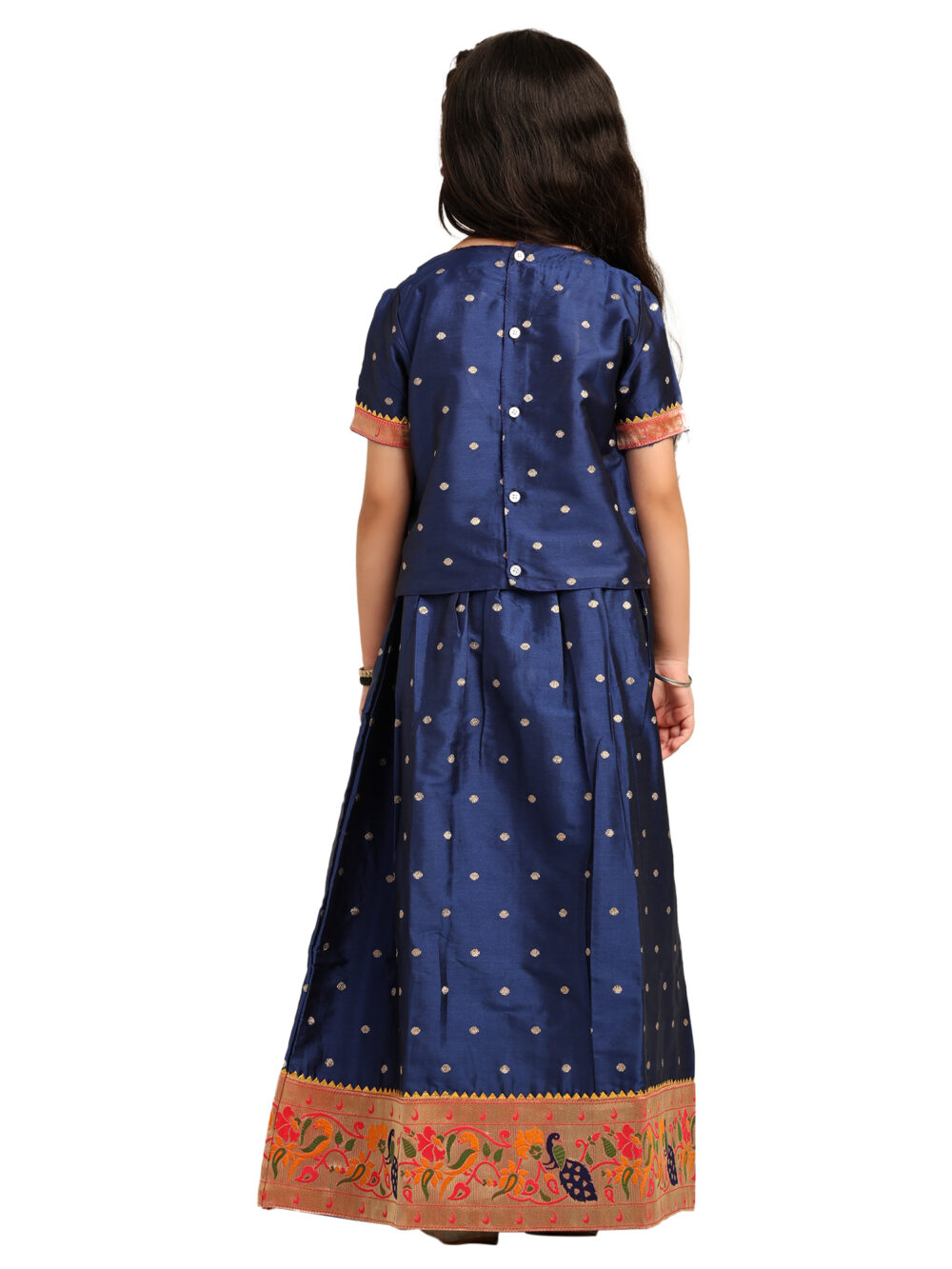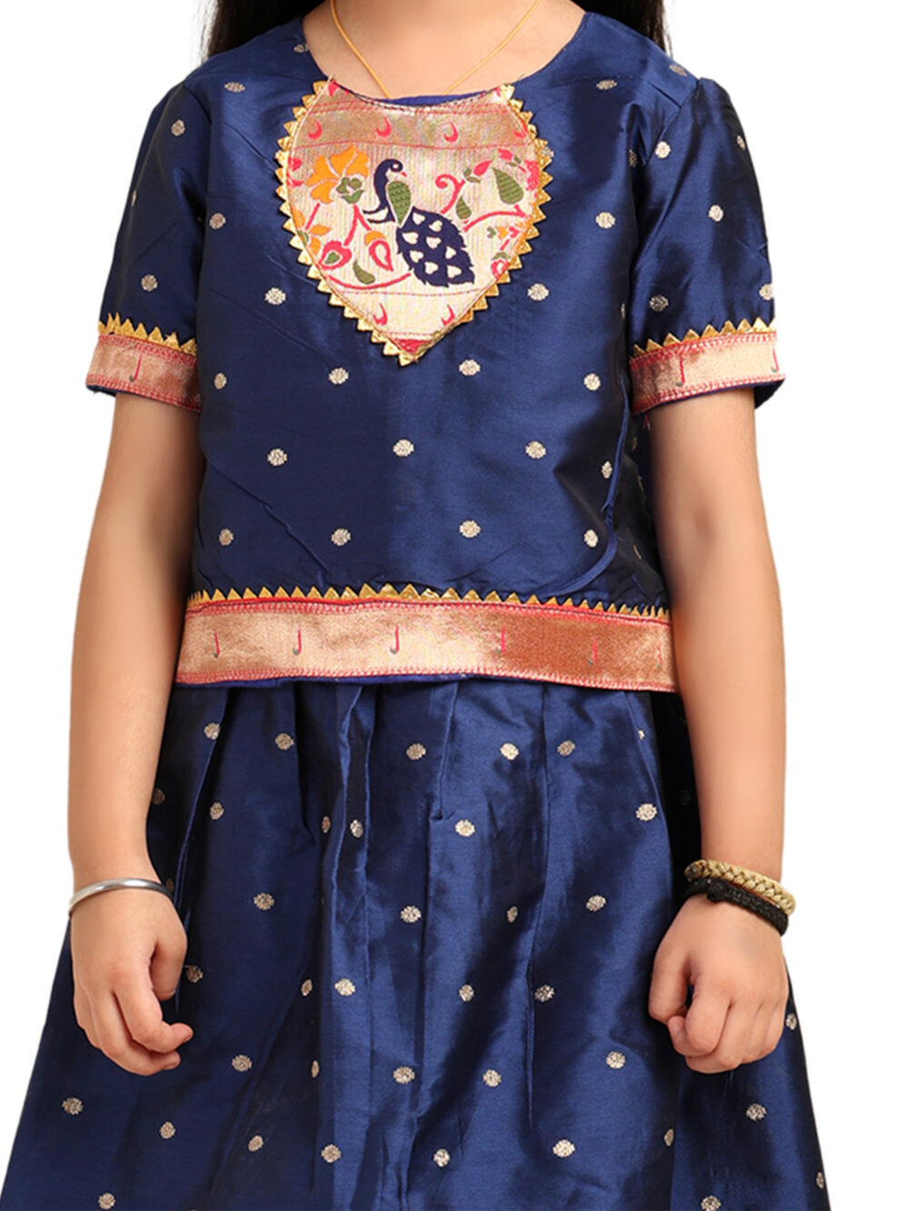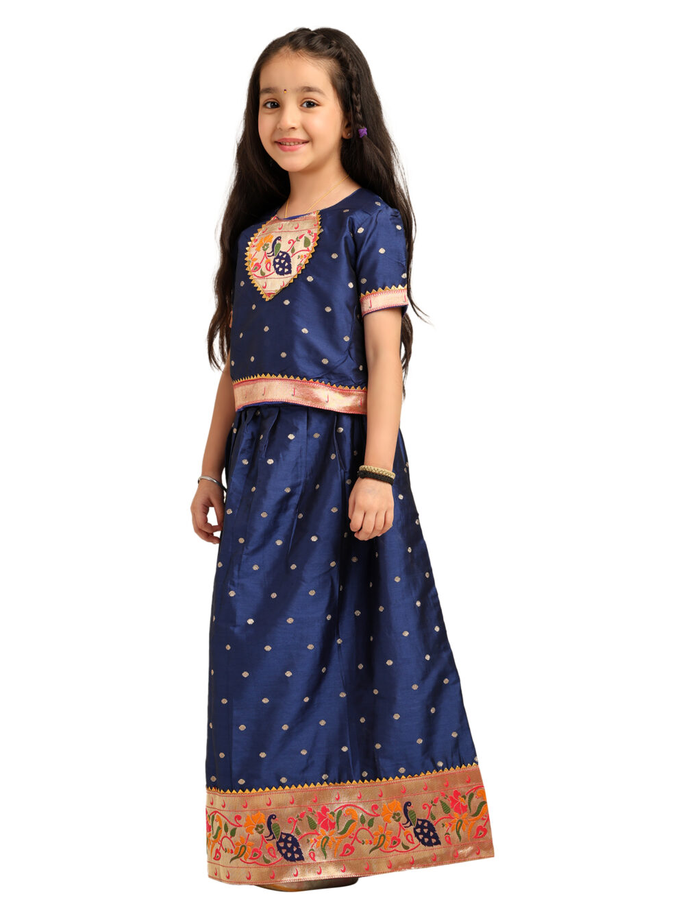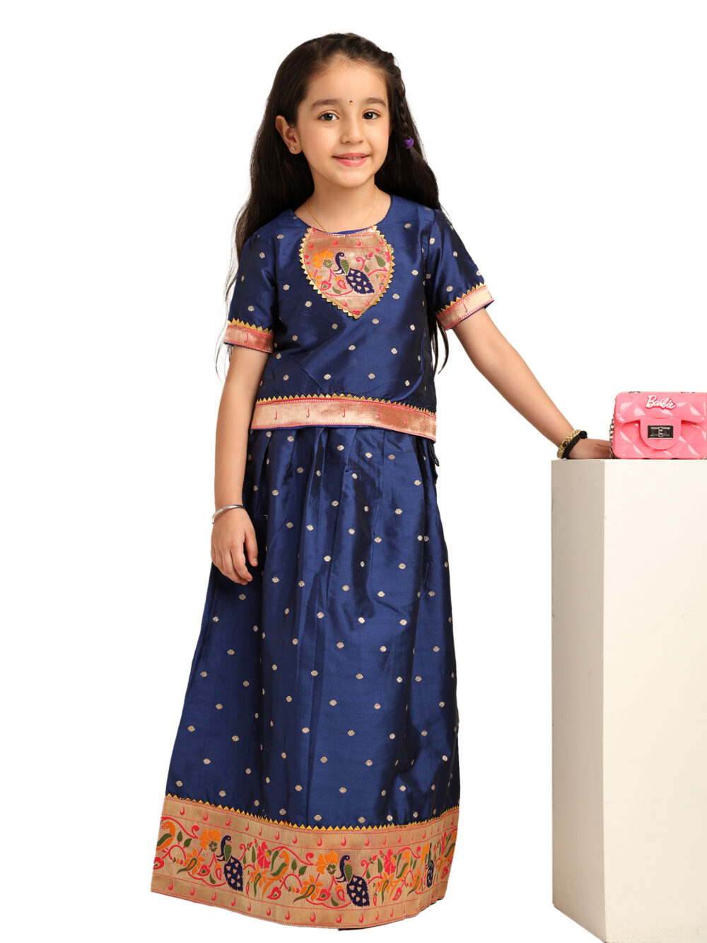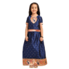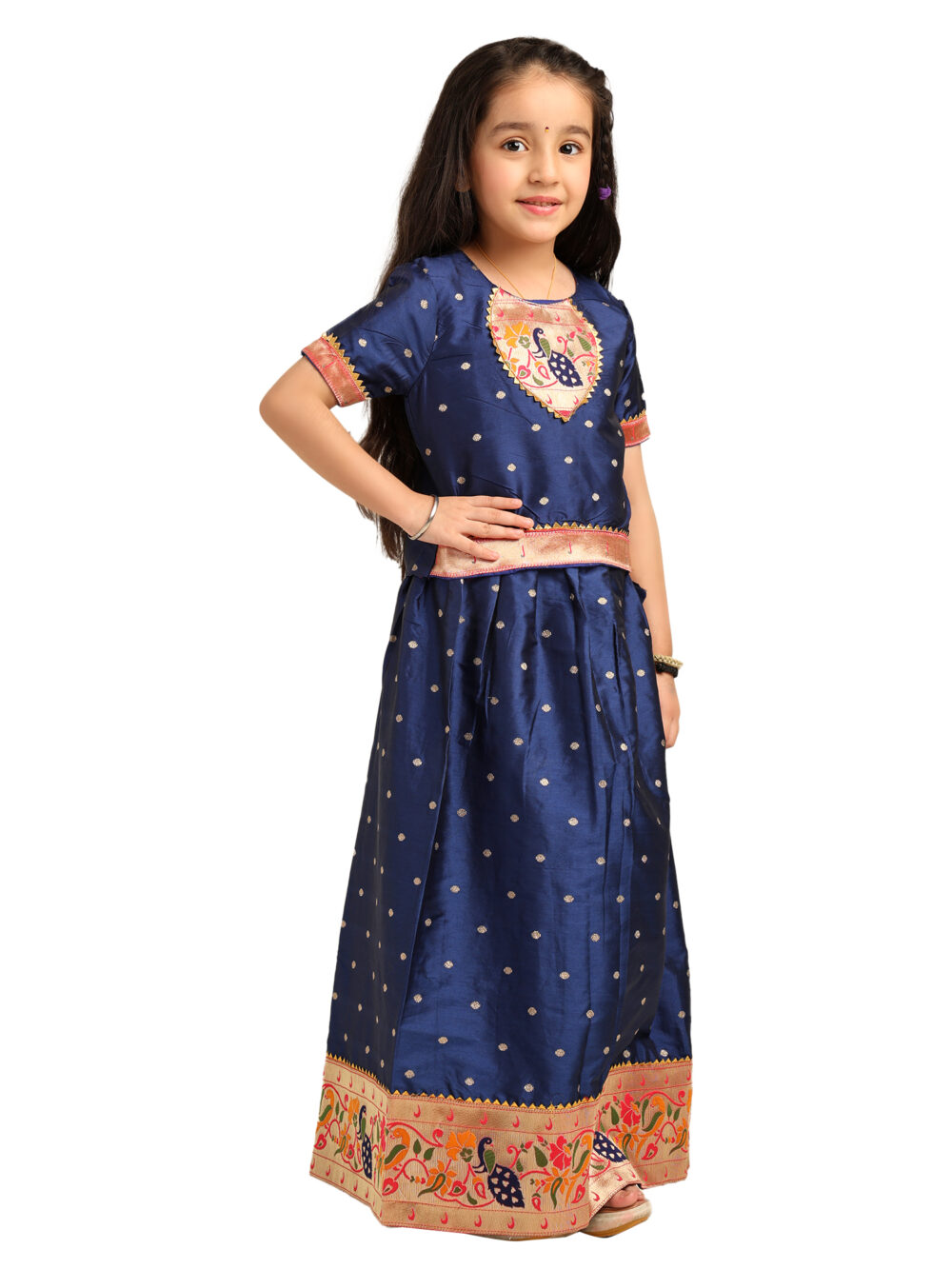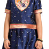 This Navy Blue Paithani Baby Girl Lehenga Set brings together royalty, tradition, and elegance in a child-friendly silhouette. The silk blouse features golden butti detailing across the fabric and is highlighted by a gorgeous peacock-embroidered yoke in a circular design with vibrant threads and zari. The sleeves and hemline are finished with a soft pink and gold brocade trim, adding richness to the look.