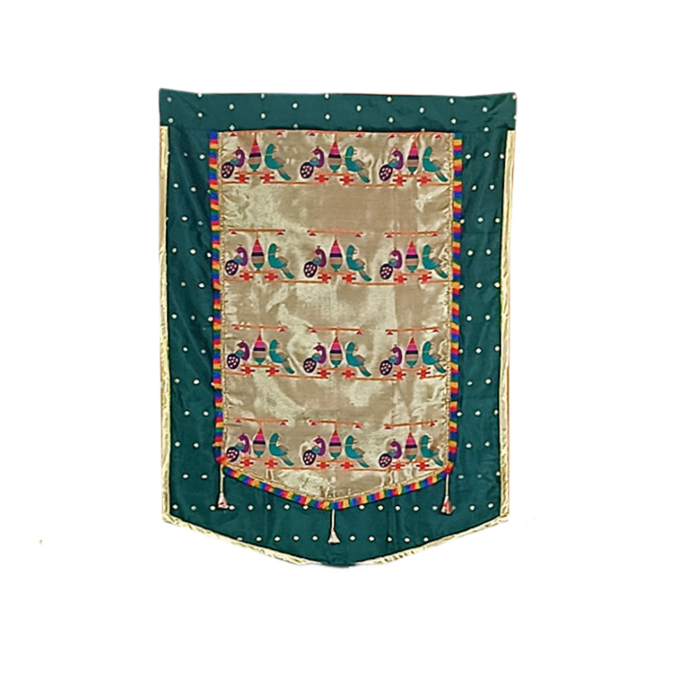 V-style backdrop with Paithani parrot and peacock embroidery, perfect for Ganesh Chaturthi, Navratri, and festive pooja décor.
