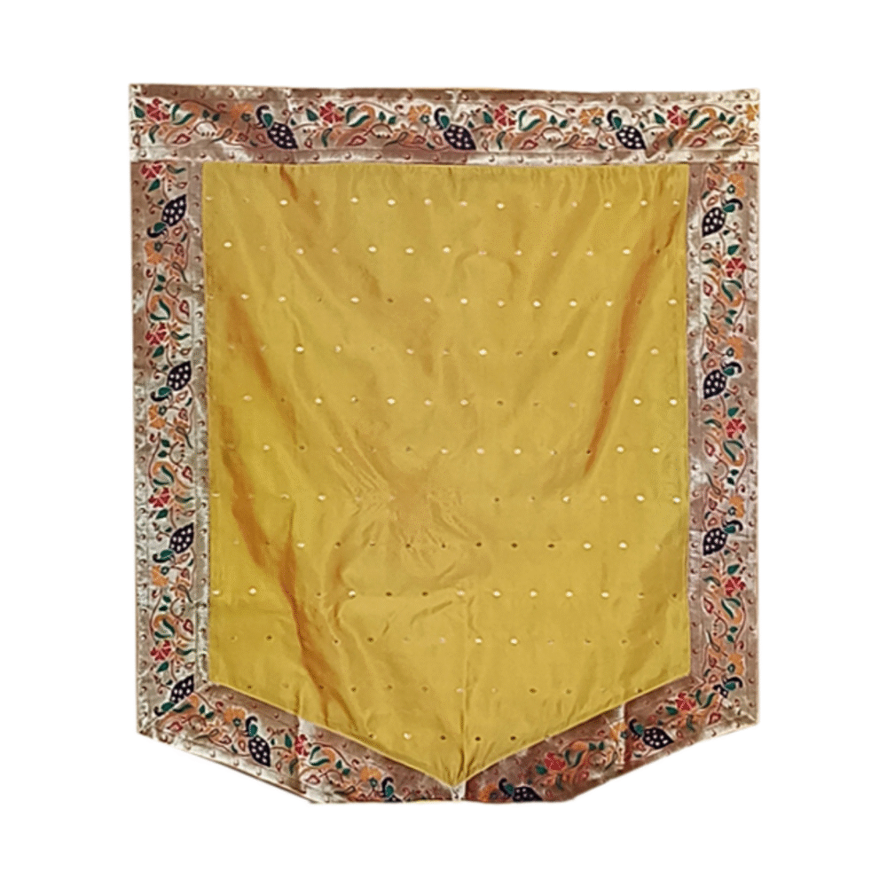 Crafted from soft satin-style fabric, this V-cut backdrop offers a temple-inspired visual that’s both regal and festive. Whether you’re decorating your mandap, pooja altar, or home space, this 31×37 inch panel fits perfectly behind idols and blends well with torans and chaurang covers.