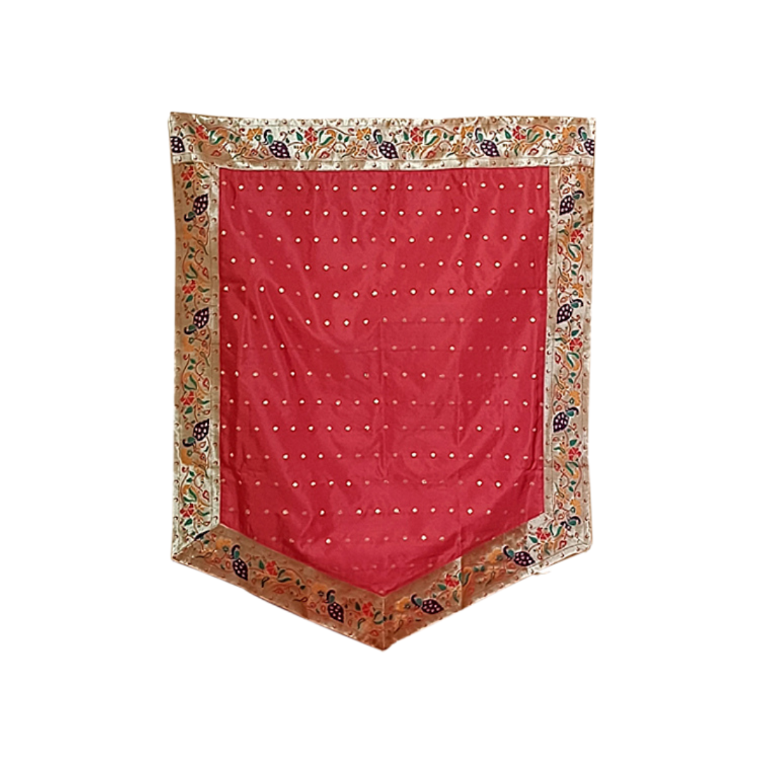 Crafted from premium silk fabric, the backdrop features a bold red base framed by shimmering gold-zari borders and detailed side pattern motifs inspired by Paithani floral and vine traditions. When placed behind your Ganesha idol or at your pooja setup, it transforms the area into a celebration of culture and colour.