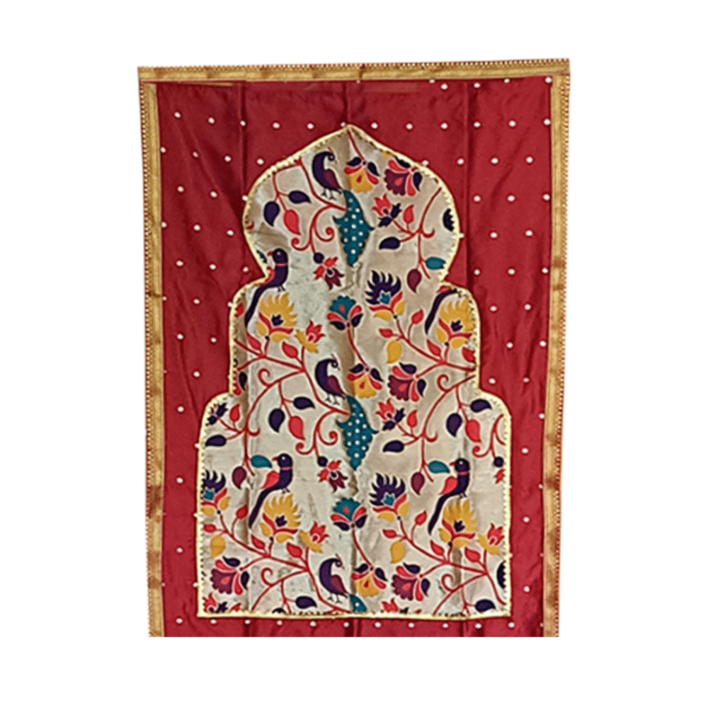 At the center is the Paithani-inspired motif of parrots, peacocks, and blooming florals in vibrant shades, symbolizing celebration and devotion. Whether placed behind a 1–2 ft murti or used in a pooja ghar, it creates a perfect devotional setting.